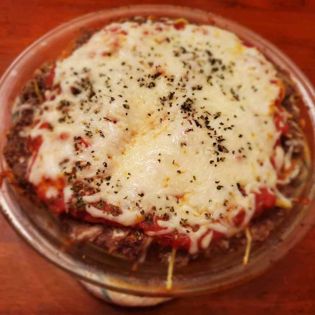 Combine ground beef, bread crumbs, onion, salt, pepper, and evaporated milk. Press mixture firmly into bottom and sides of 9″ pie plate. Bake at 350°F 30 mins. Spoon off drippings. Combine cooked spaghetti with beaten egg, Parmesan, and butter. Spread evenly in baked meat shell. Top with pizza sauce, mozzarella, and oregano. Bake approximately 15 mins.
